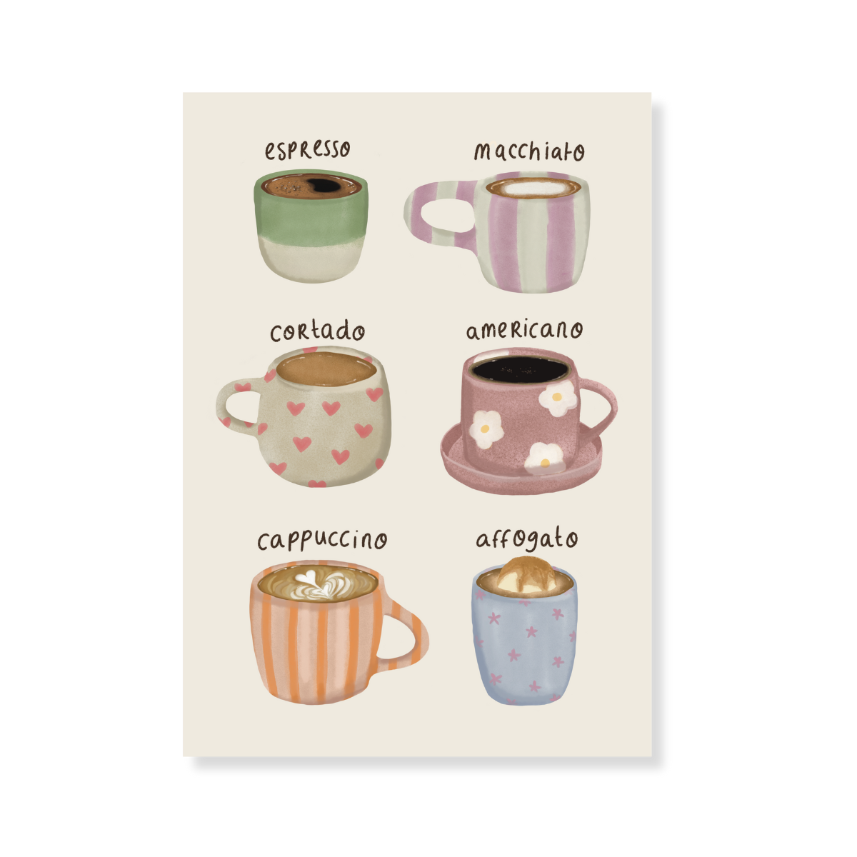 Voor de echte koffieliefhebber! Deze poster toont een vrolijke verzameling koffiesoorten, elk stijlvol afgebeeld in een kleurrijke mok. Van espresso tot cappuccino en (mijn favoriet) de affogato. Een speelse en stijlvolle toevoeging aan je keuken, koffiehoek of werkplek.