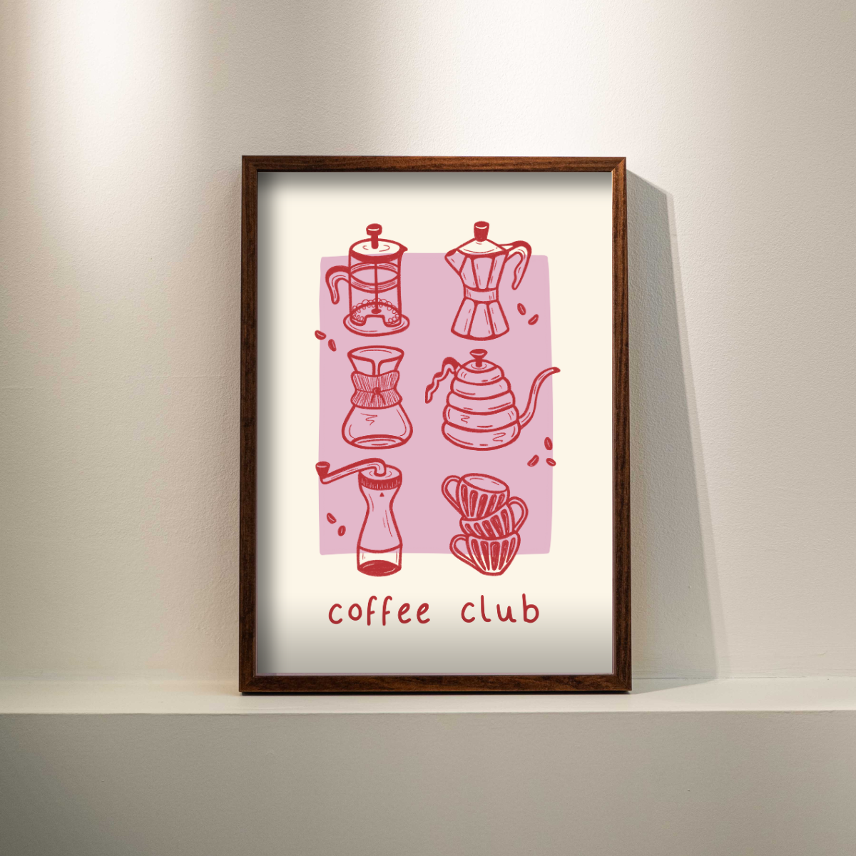 Handgemaakte Illustratie – Koffie poster 'coffee club' - Rood/roze