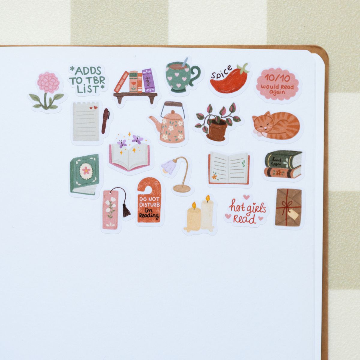 Op dit stickervel vind je een mix van boeken illustraties en speelse teksten: stapels boeken, een warme mok thee, kaarsen, een leeslampje, planten, een slapende kat en herkenbare quotes zoals “hot girls read” en “adds to TBR list”. Ideaal om leesmomenten vast te leggen, TBR-pagina’s te versieren of je journal een persoonlijke touch te geven.