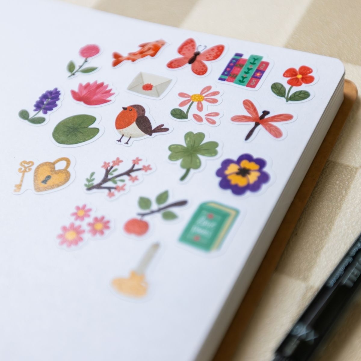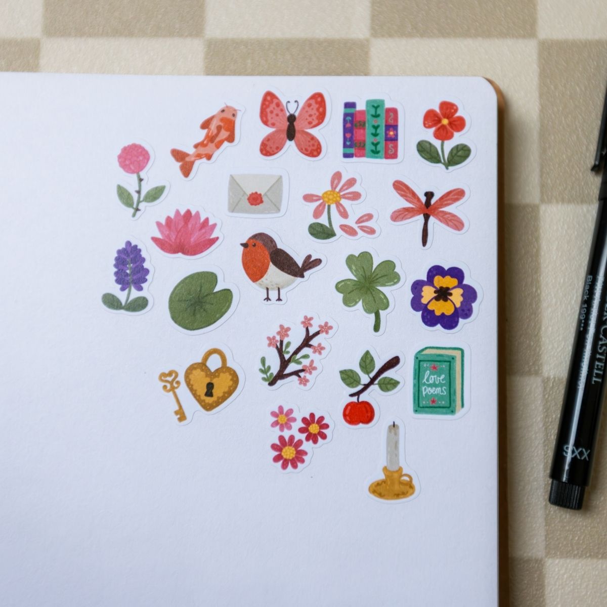 Dwaal door een wereld vol zachte kleuren en poëtische details met de Poet’s Garden Stickersheet. Deze handgetekende illustraties van bloemen, vlinders en kleine gelukssymbolen brengen een dromerige, natuurlijke sfeer in je journal of briefpapier.