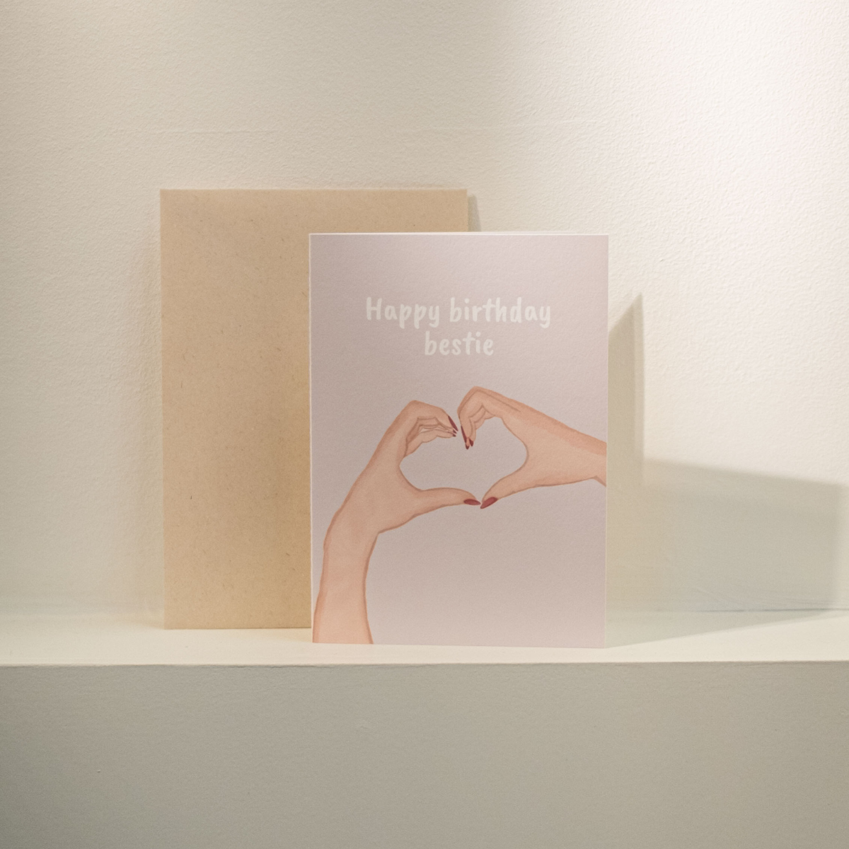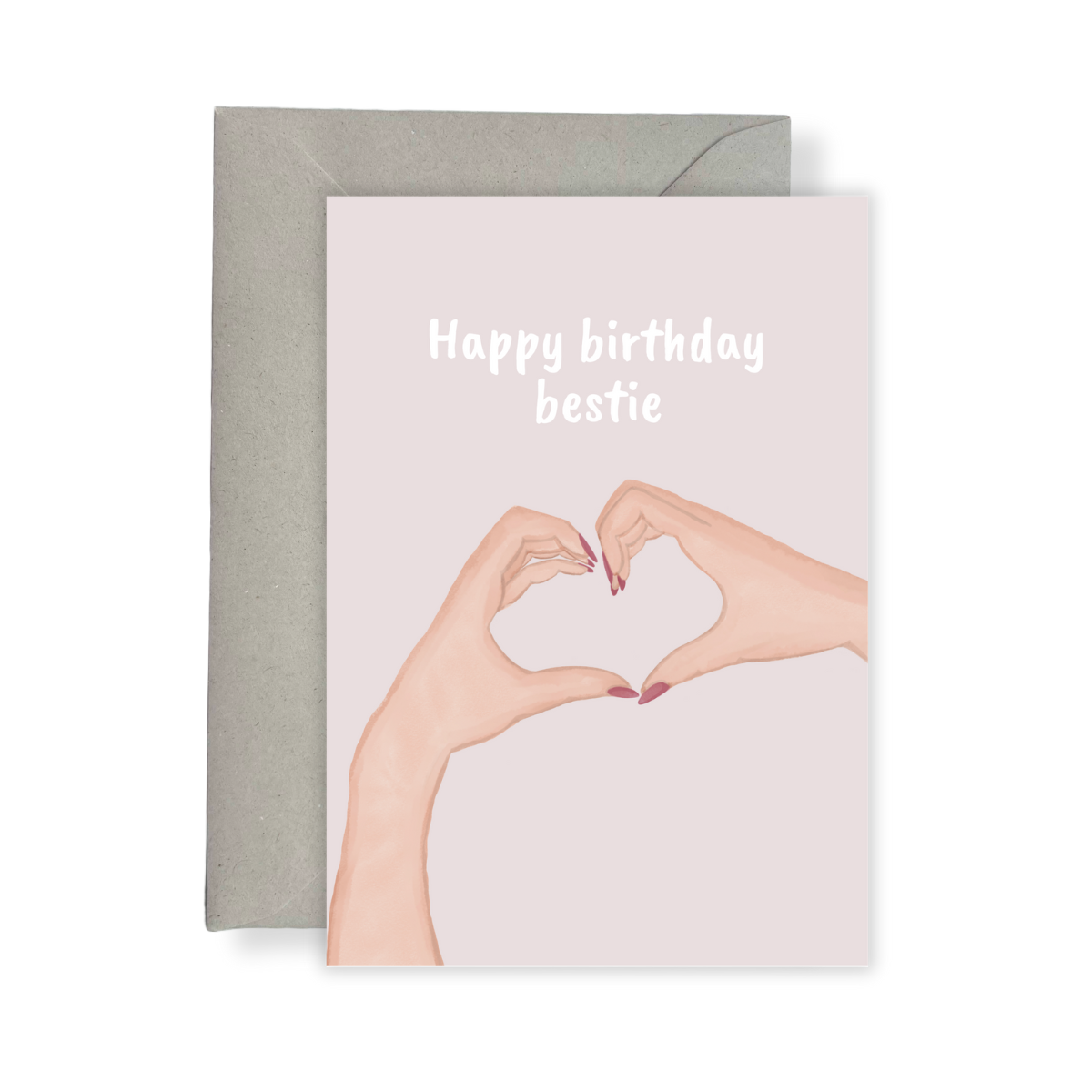 Vier de verjaardag van je bestie met deze lieve en feestelijke wenskaart! De kaart is bedrukt met de tekst 'Happy birthday bestie' en een schattige illustratie van hartjes handen, perfect om jouw vriendschap te vieren.
