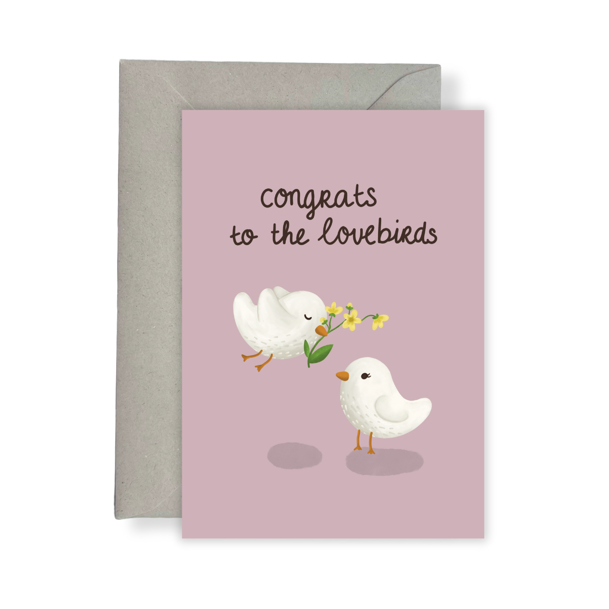 Een stijlvol kaartje met twee witte vogels en de tekst ‘Congrats to the lovebirds’. Perfect om liefde te vieren bij een verloving, huwelijk of jubileum.